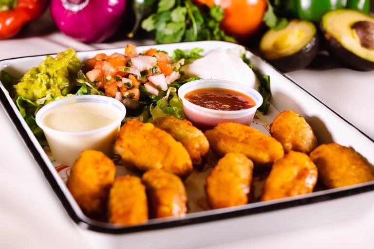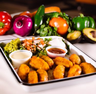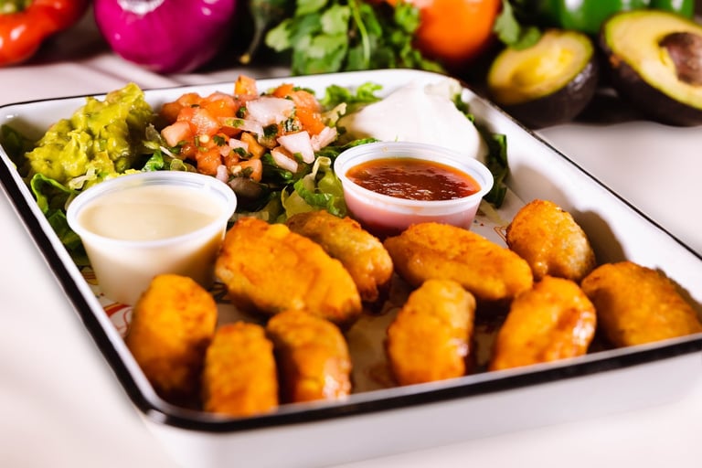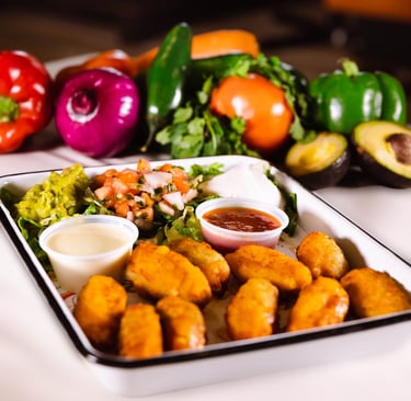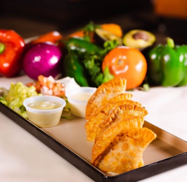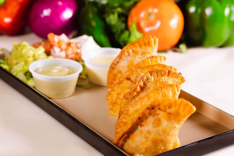 Three homemade seasoned ground beef or chicken empanadas served with queso cheese dip & house-made pipian sauce.