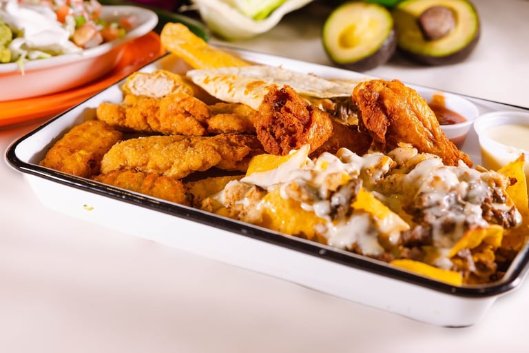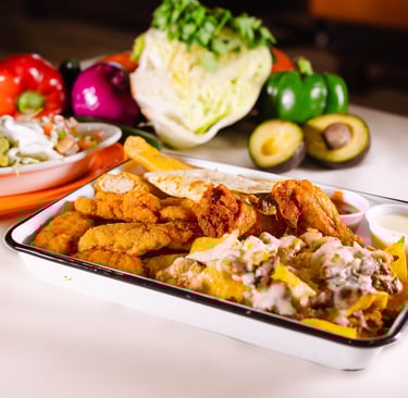 Your choice of meat topped on nachos & quesadillas. Comes with two stuffed jalapeños, chicken wings, a chicken flauta, two cheese enchas & a side of queso.