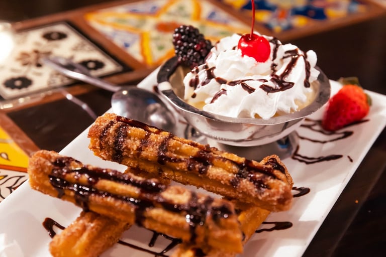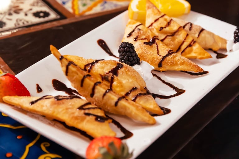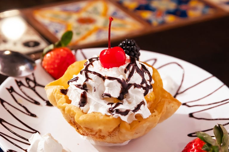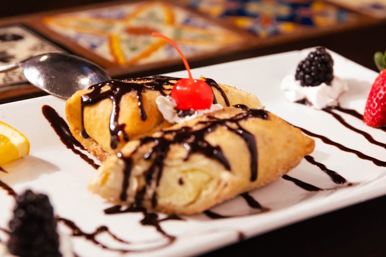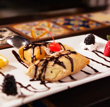 Lightly fried chimichanga cheesecake topped with chocolate syrup and caramel. Served with a side of ice cream.