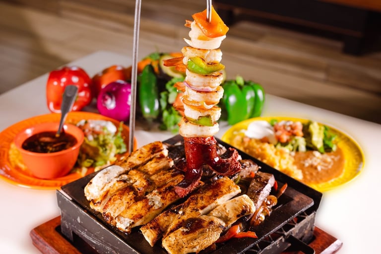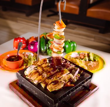 One half-dozen shrimp, carne asada (grilled steak), sausage, grilled chicken breast, onions and bell peppers; lettuce, guacamole, sour cream & Pico de Gallo included on the side with six corn or flour tortillas. Served with rice & your choice of either charro or refried beans.