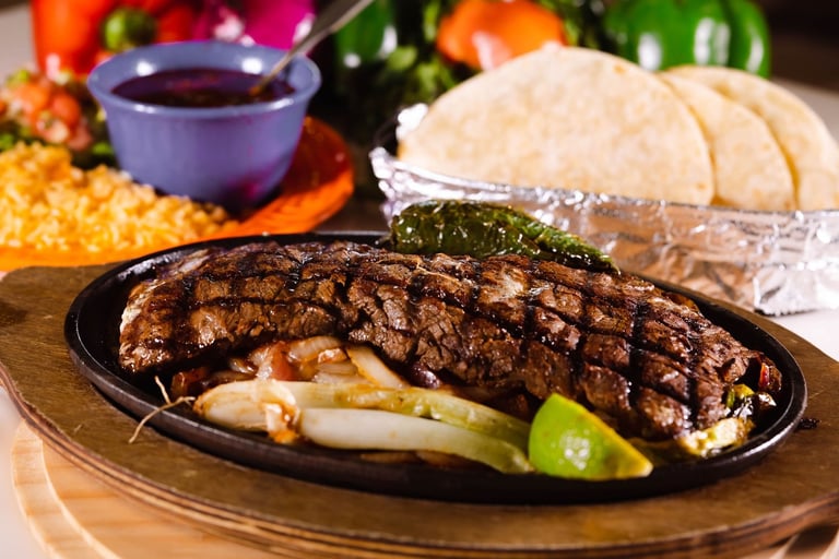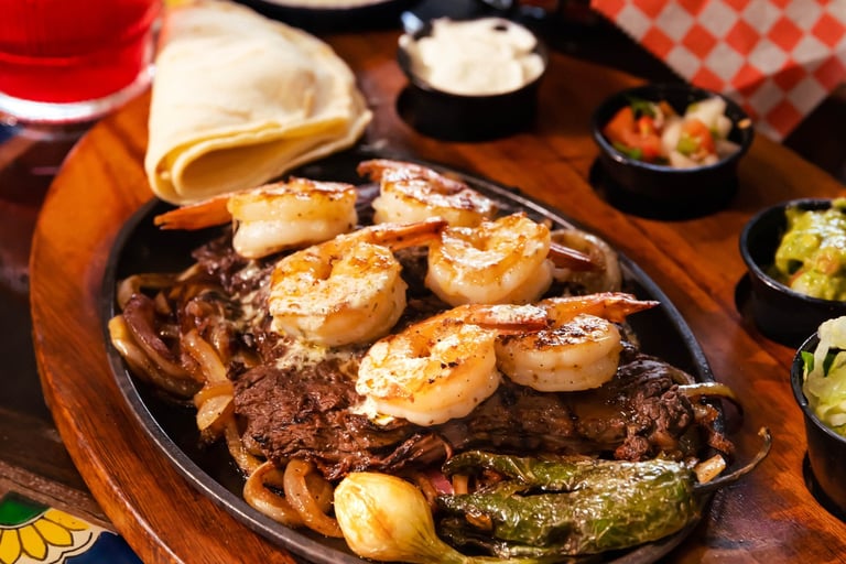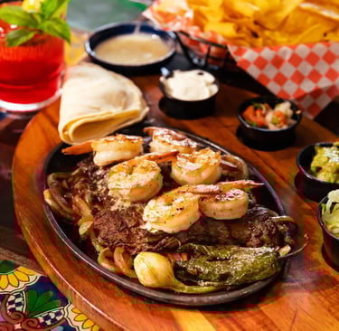 Skirt steak sizzling with onions that comes with six grilled shrimp, black beans, cilantro rice, guacamole salad and tortillas.