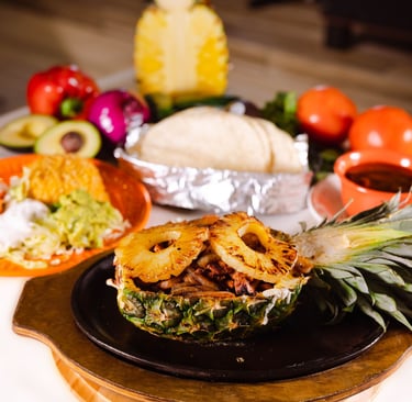 Marinated pork strips in adobo sauce with pineapple & onions. Served with rice & refried beans, guacamole salad, Pico de Gallo, sour cream & flour tortillas.
