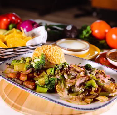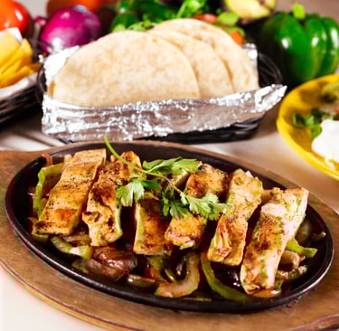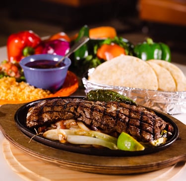 Your choice of meat, sizzling with onions & bell peppers, served with lettuce, Pico de Gallo, sour cream, and guacamole on the side. Your choice of tortillas, rice and beans.