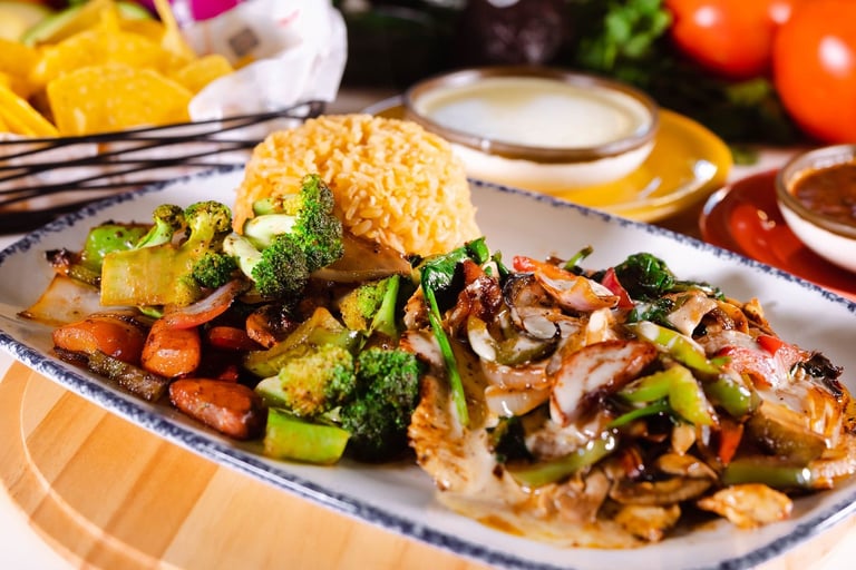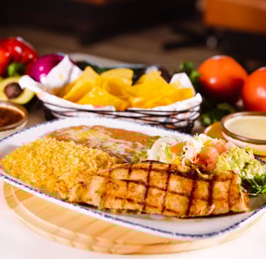 Grilled chicken breast topped with mushrooms, bell peppers & onions. Served with rice, cheese dip & grilled vegetables.