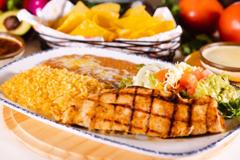 Grilled chicken breast served with rice, refried beans & guacamole salad.