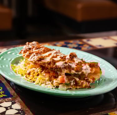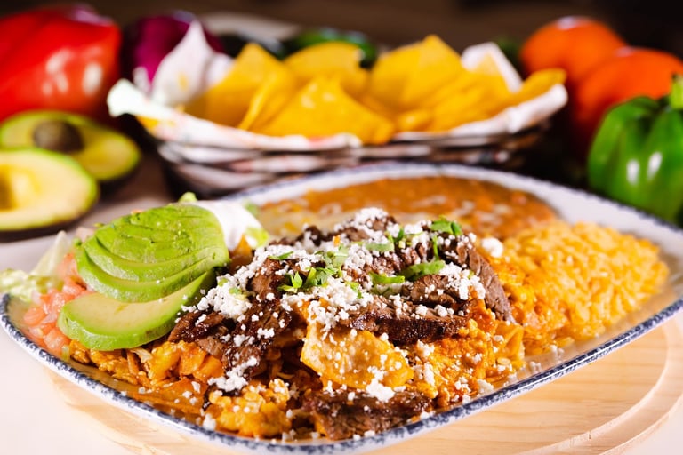 Soft tortillas cooked slowly with eggs & sauce, topped with steak and served with rice & beans, lettuce, sour cream, queso fresco & Pico de Gallo.