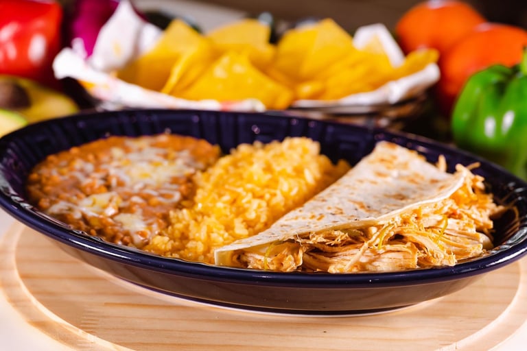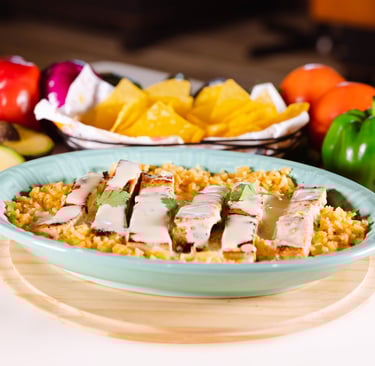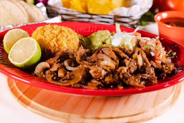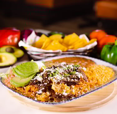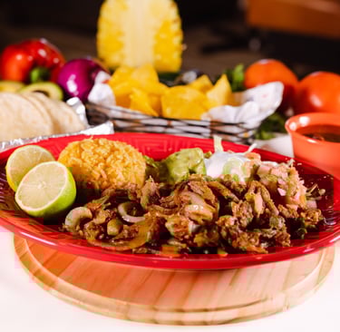 Served with rice, charro beans, guacamole, lettuce, sour cream, Pico de Gallo & tortillas.