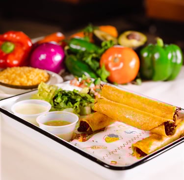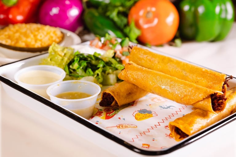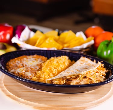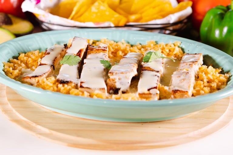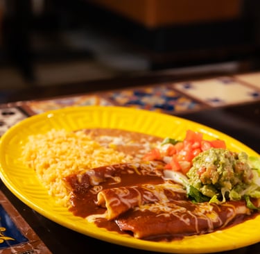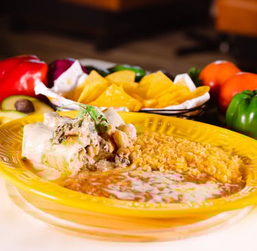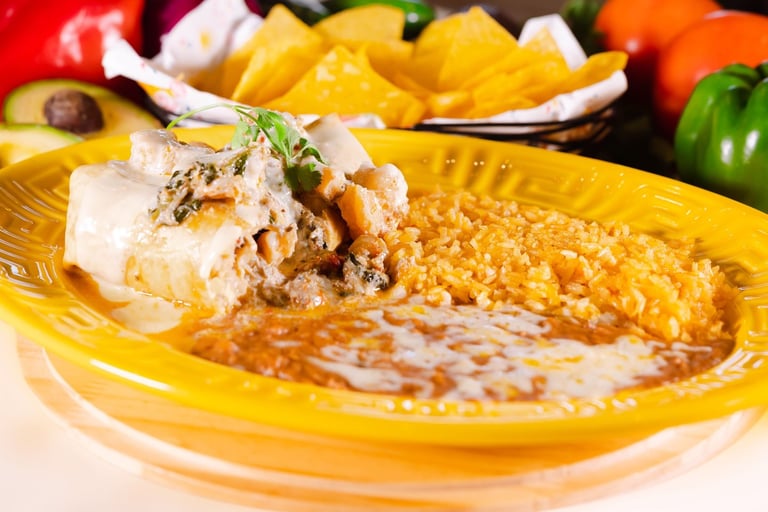 Fried burrito served with lettuce, tomato, guacamole & sour cream topped with cheese sauce. Served with a side of rice and beans.