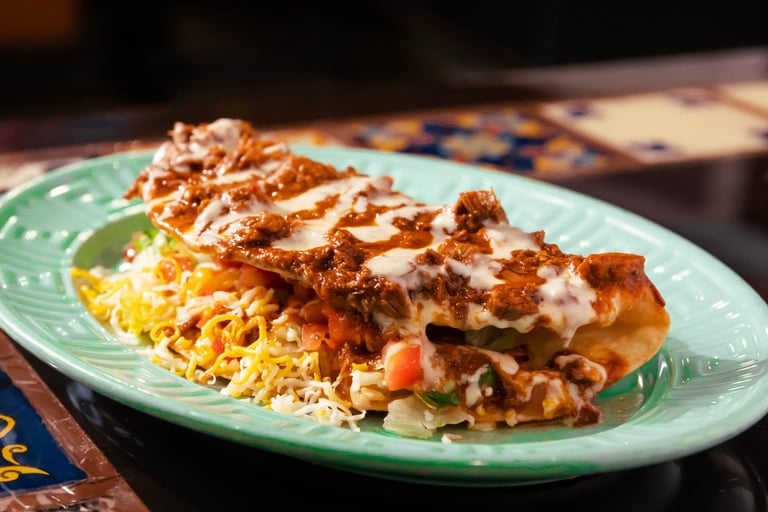 Large, crunchy flour tortilla filled with ground beef, lettuce, tomato, topped with chili con carne and cheese dip.