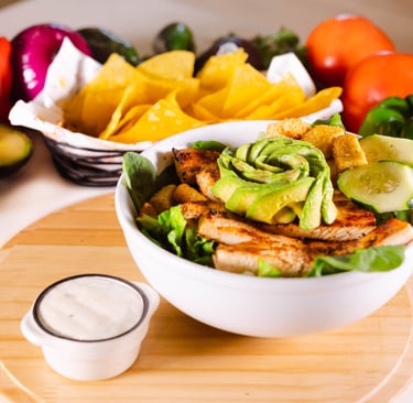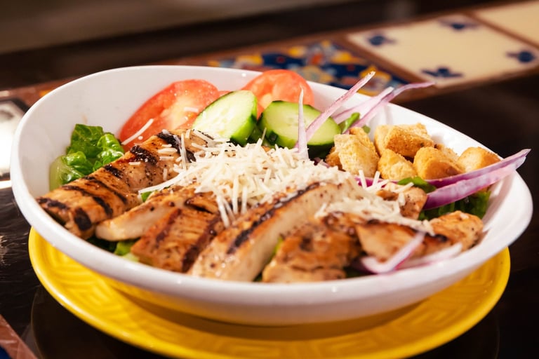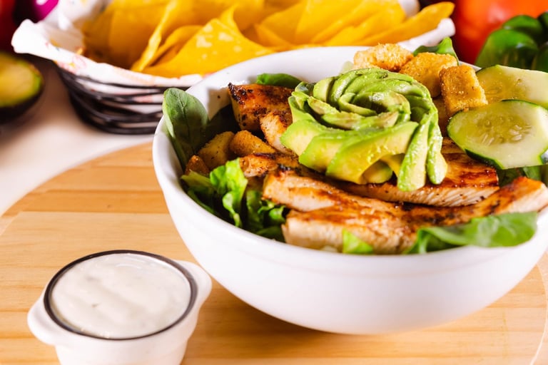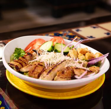 Grilled chicken over romaine lettuce, spinach, avocado, cucumber, tomato & croutons.