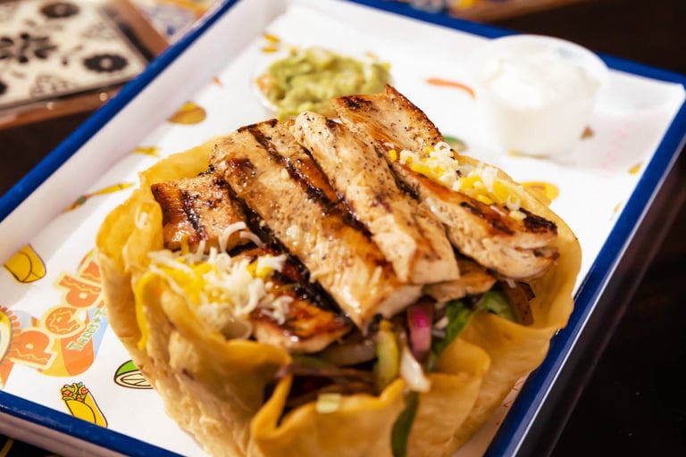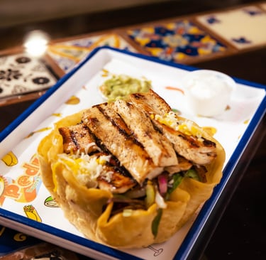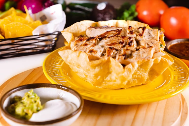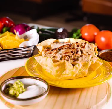 Sizzling fajitas cooked with onions & bell peppers. Served with lettuce, guacamole and sour cream in a taco bowl.