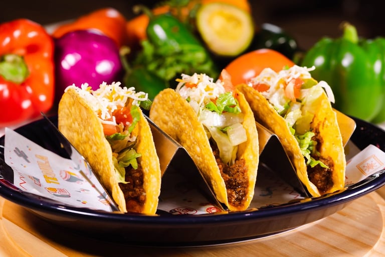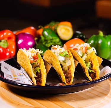 Three beef or chicken tacos topped with lettuce, tomatoes & cheese.