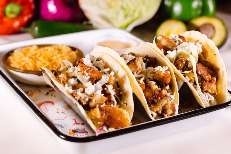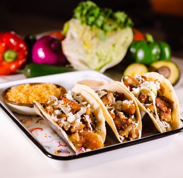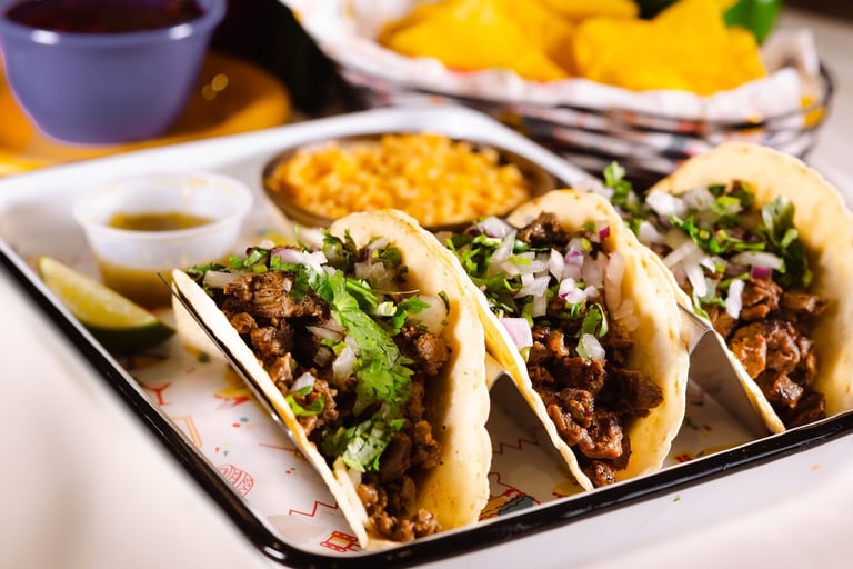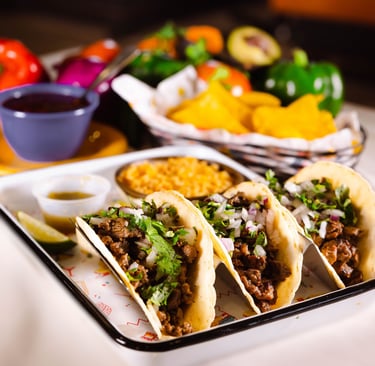 Three tacos served with charro beans, rice, cilantro & onions